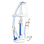 This medieval-style bridle features a face plate with a cross piece that runs down the forehead and splits in two before attaching to the top of the noseband, creating a “war horse” affect that really turns heads.