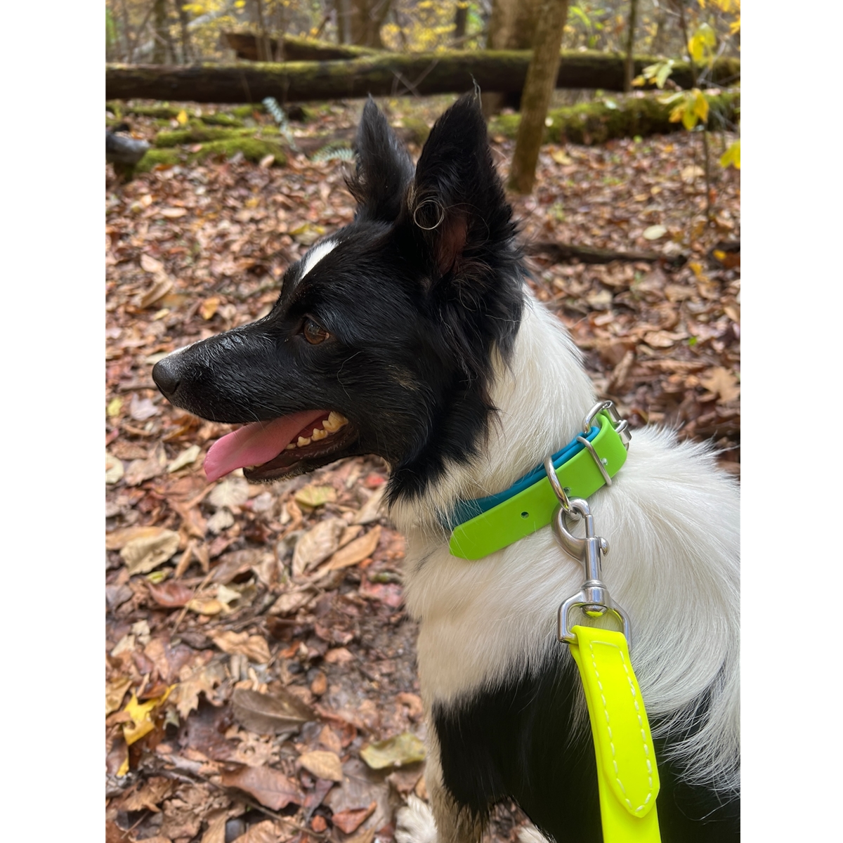 WATERPROOF! Beta Biothane is a web coated nylon. The exterior coating is impenetrable to liquids. Moisture rolls right off