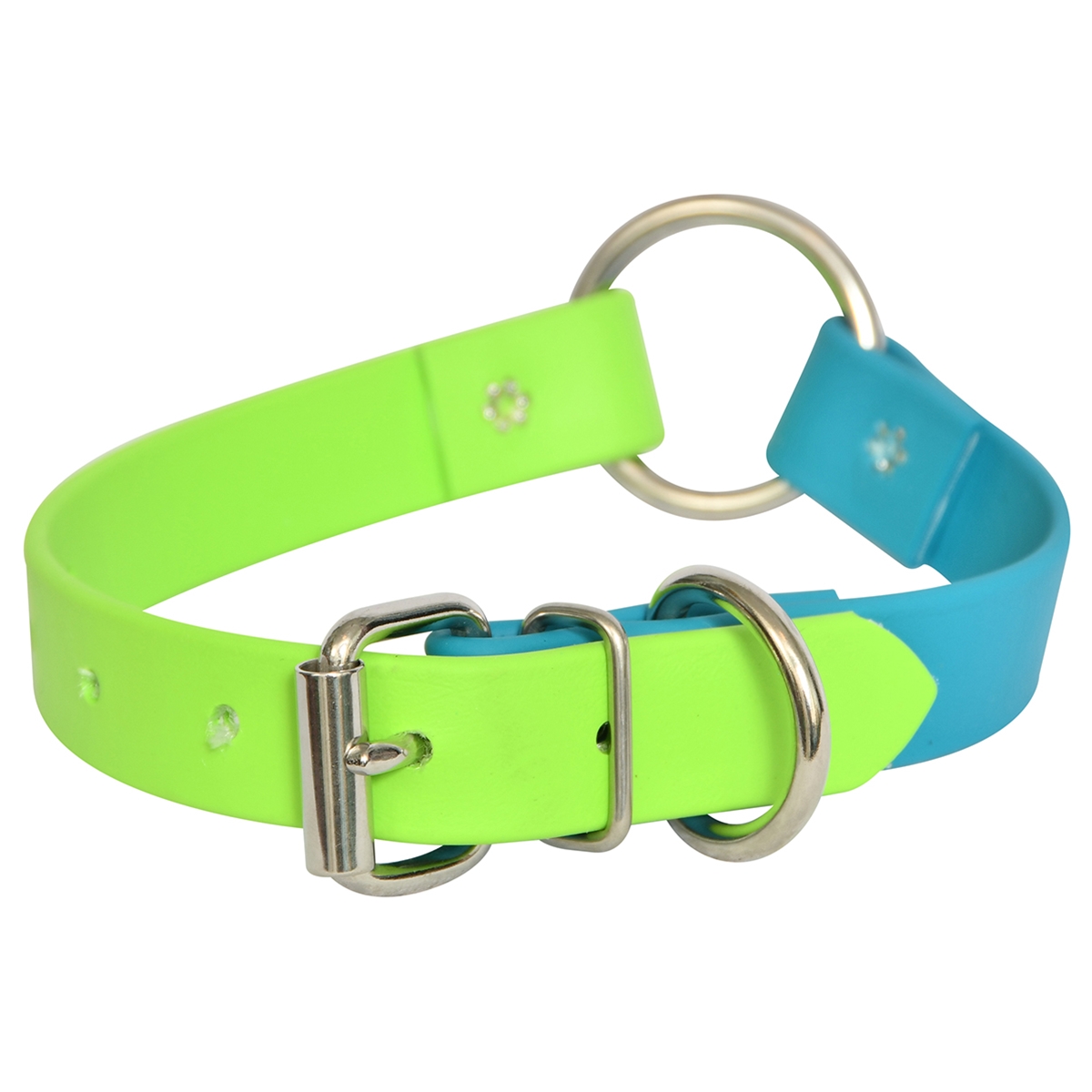 Custom made Dog Collar with center ring to improve safety, keeping the leash away from the buckle. Made from Beta Biothane.