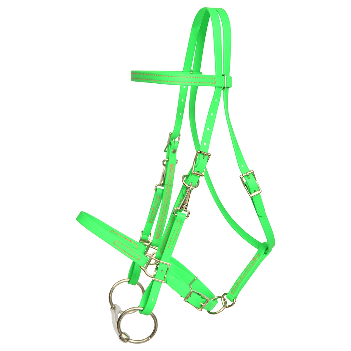 ****PHOTO SAMPLE*** $30 Lime Green with Pink Thread Beta Biothane Halter Bridle with Bit Hangers Headstall - Horse Size