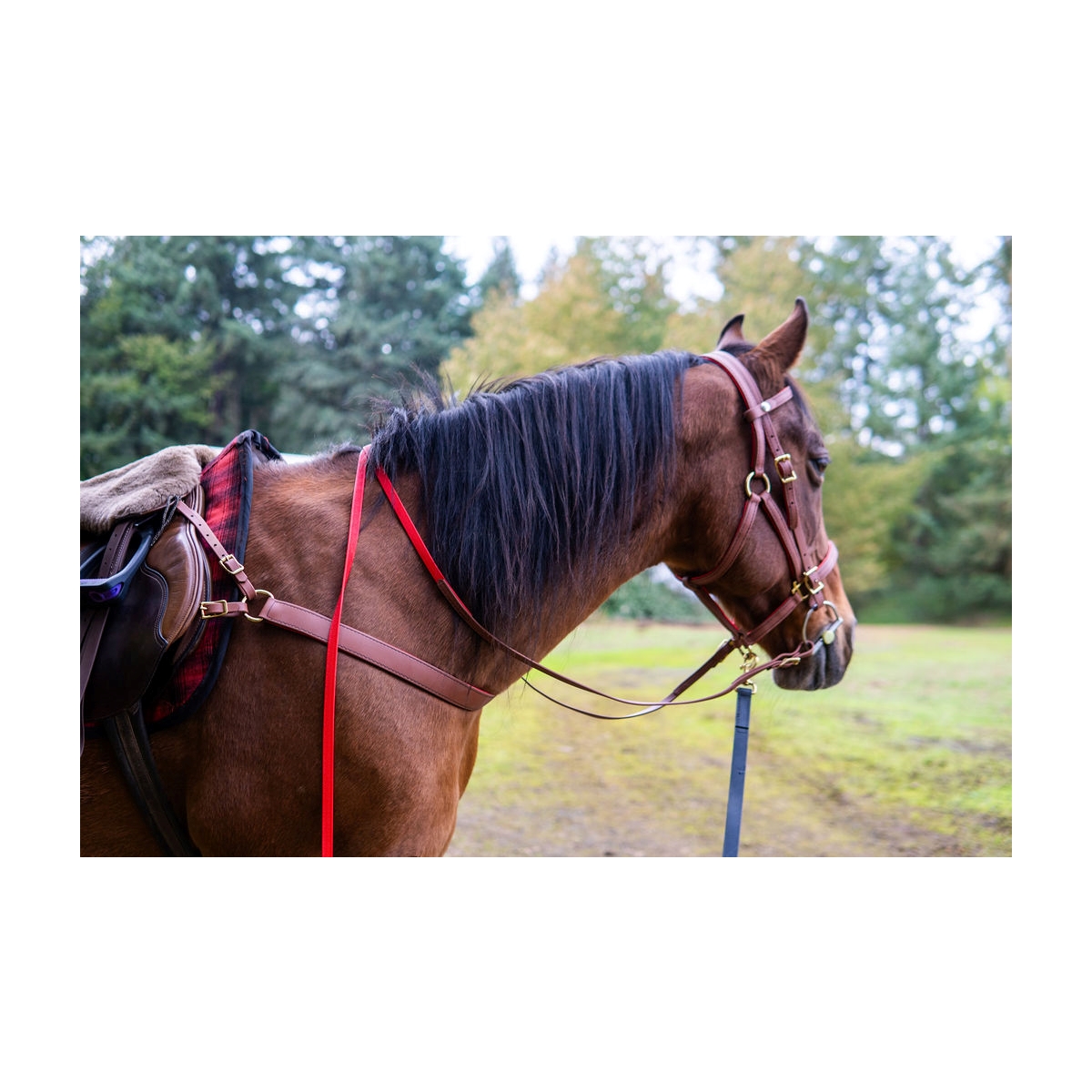 Simple, adjustable, one piece breast strap that is highly effective keeping saddle from slipping.