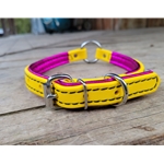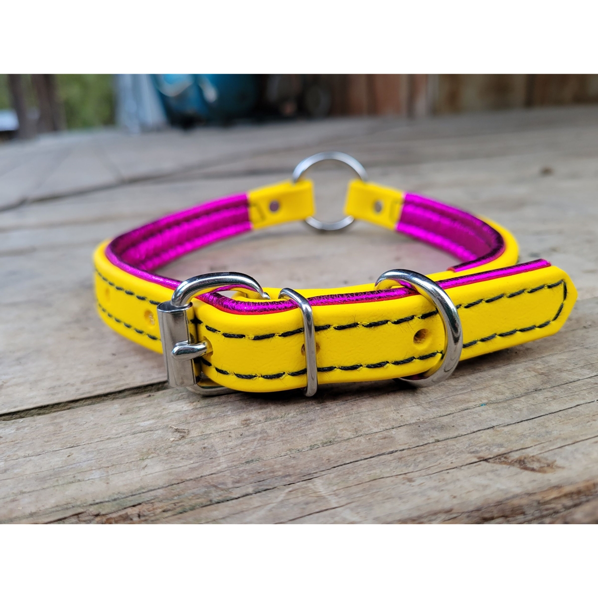Custom made dog collar with center ring to improve safety, keeping the leash away from the buckle. Made from beta biothane with our special metallic leather padding.