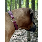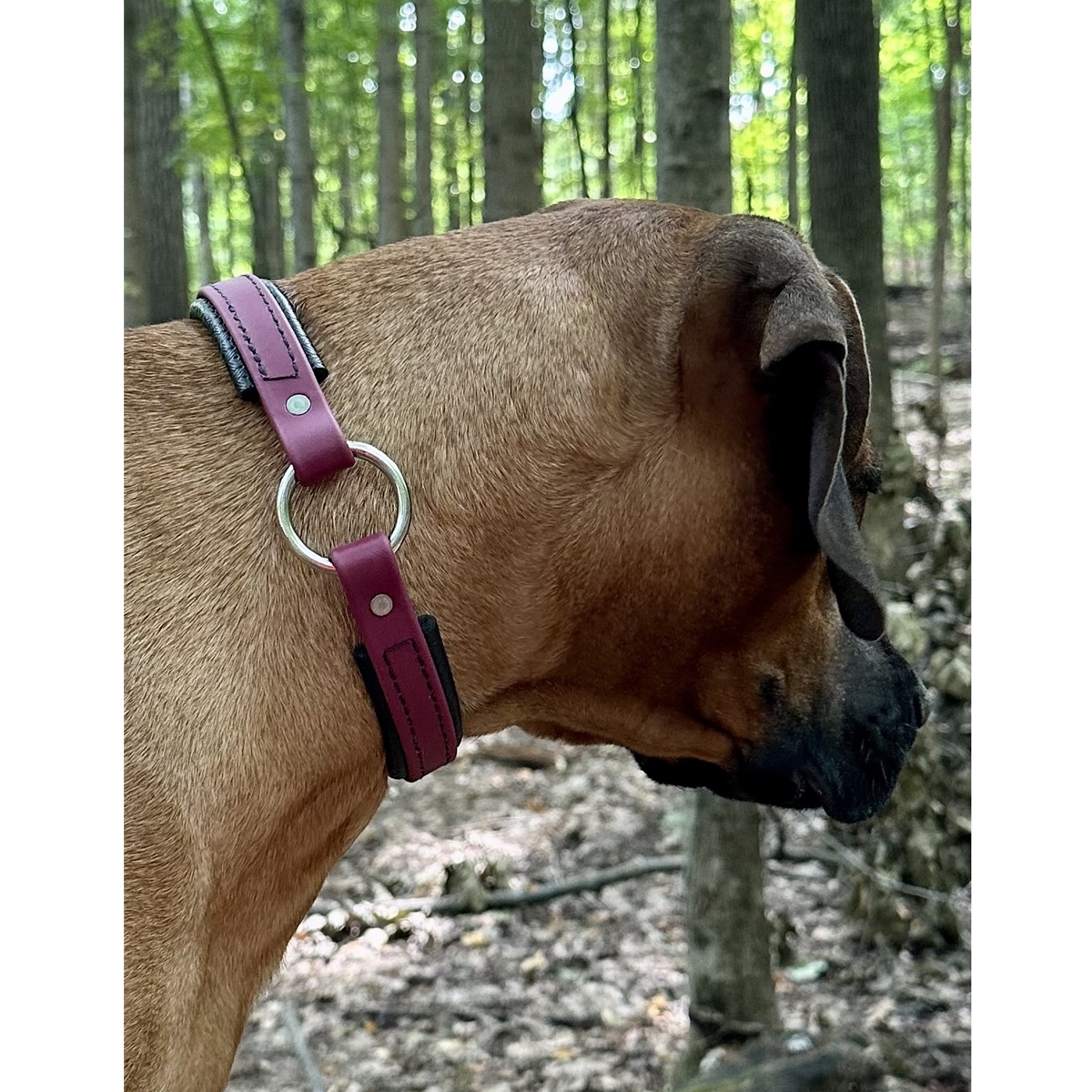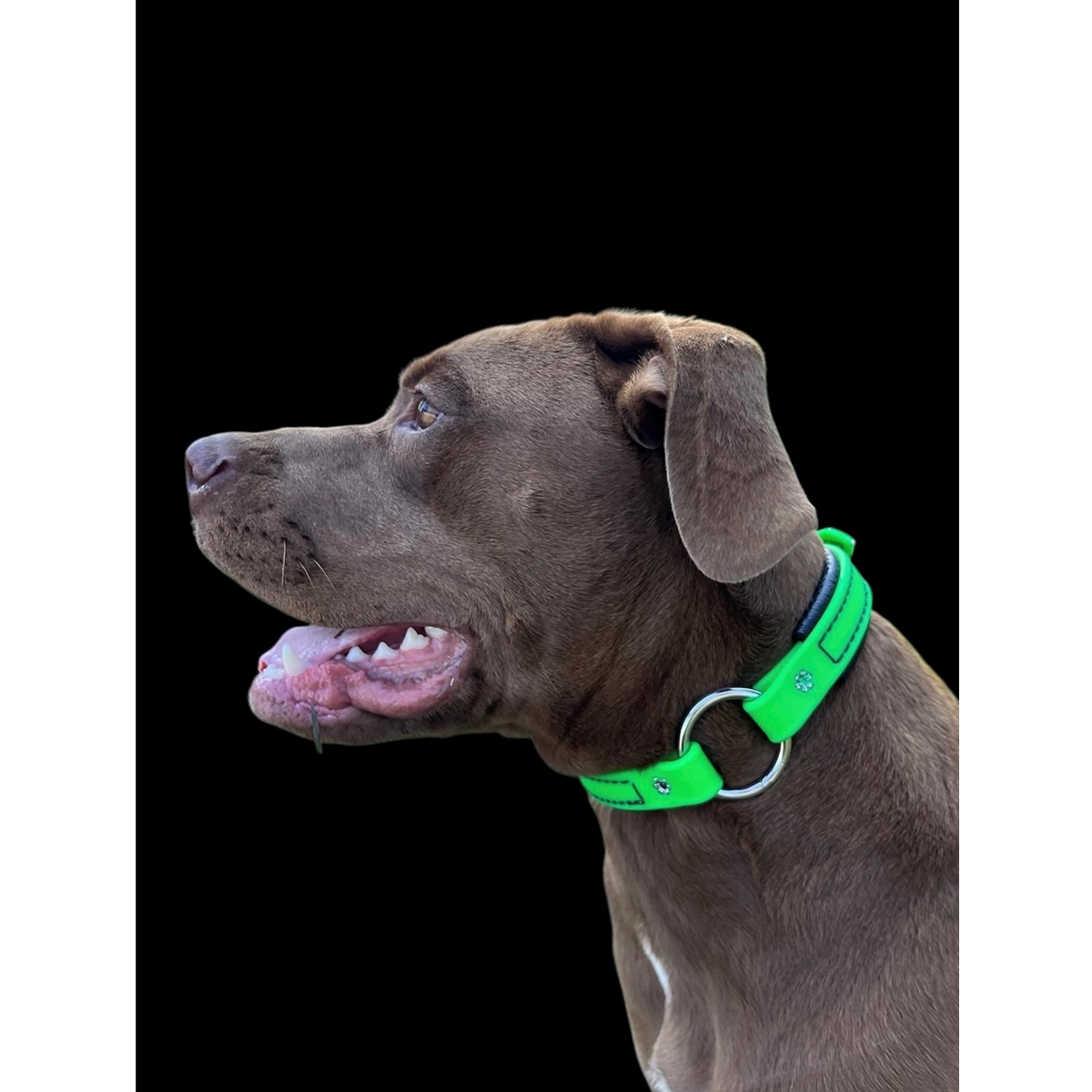 Custom made dog collar with center ring to improve safety, keeping the leash away from the buckle. Made from beta biothane with light weight neoprene padding.