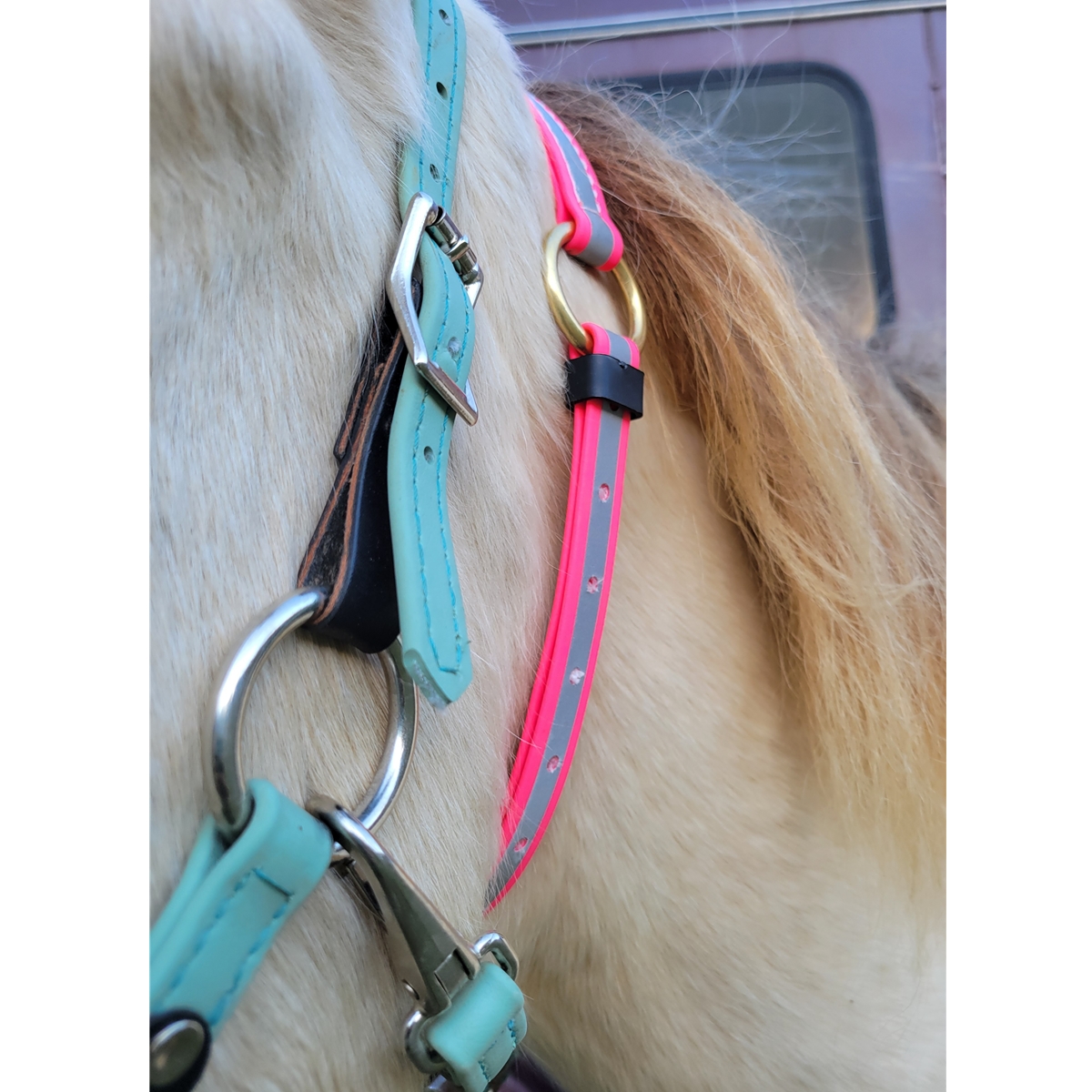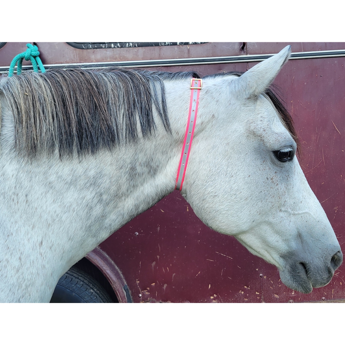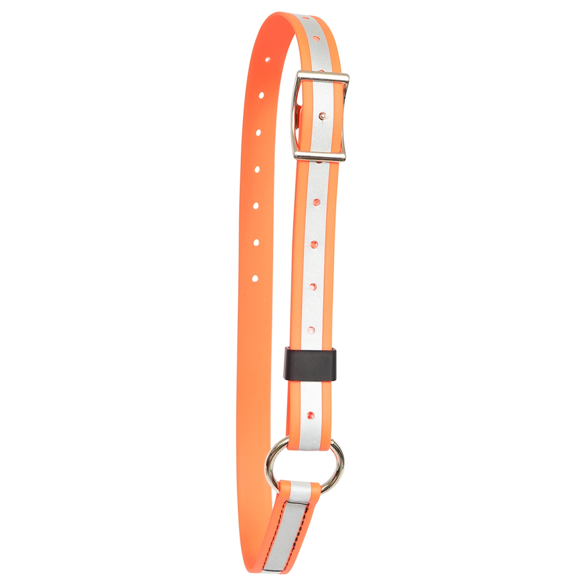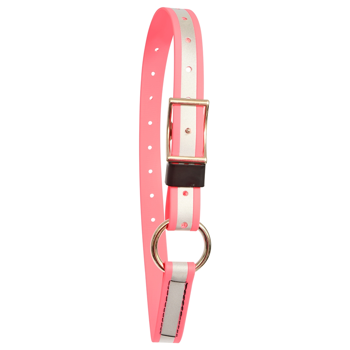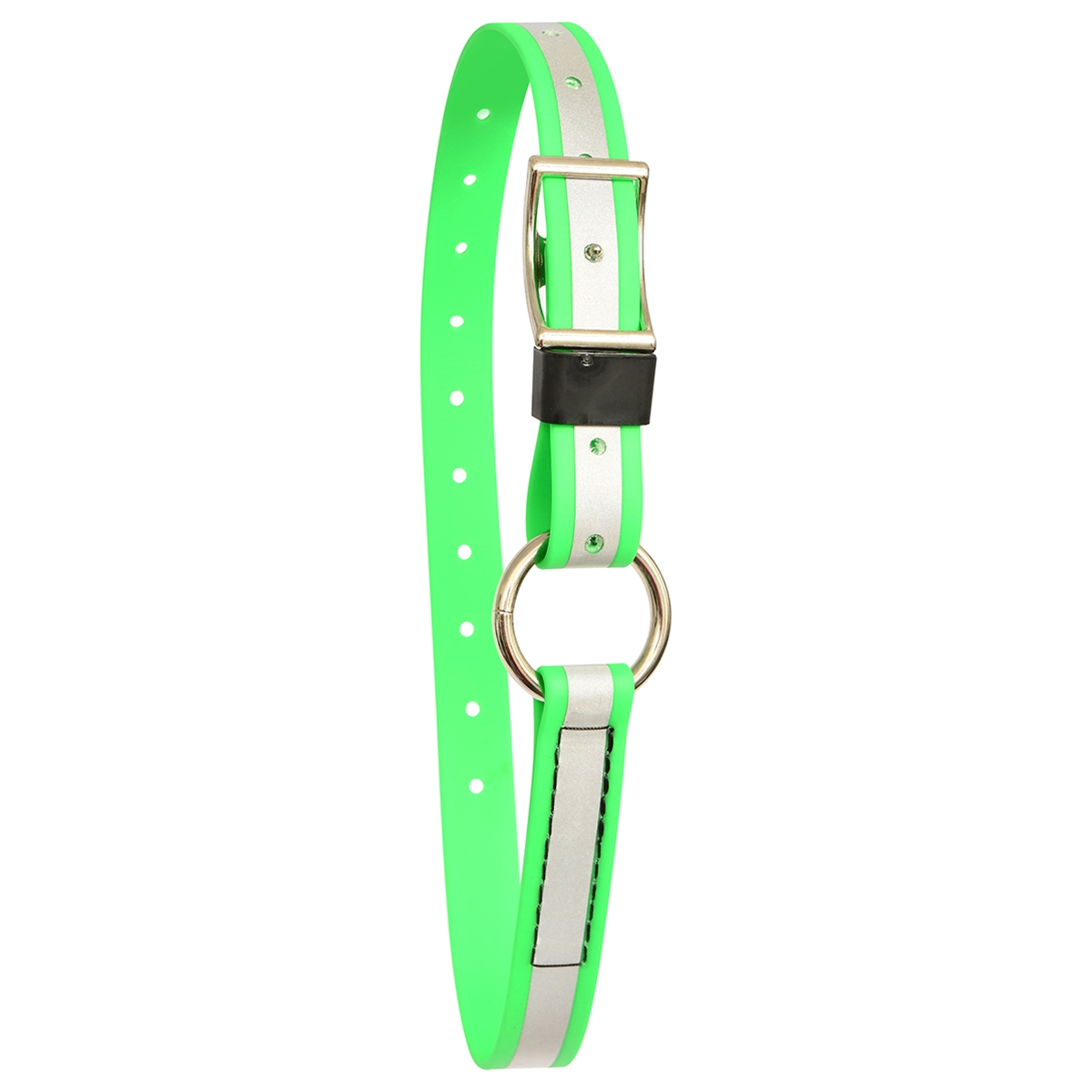 This design features a ring that can be used to clip on lead ropes or shanks. This neck collar features a buckle closure and is fully adjustable.