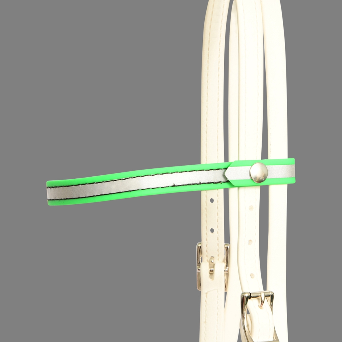 This is a replacement browband made from reflective beta biothane. This is the browband only. Be sure to measure your existing browband before ordering for optimum fit. This is our snap-on variety, which makes for easy on/off and is also a great fit if you use a rope halter under your bridle.