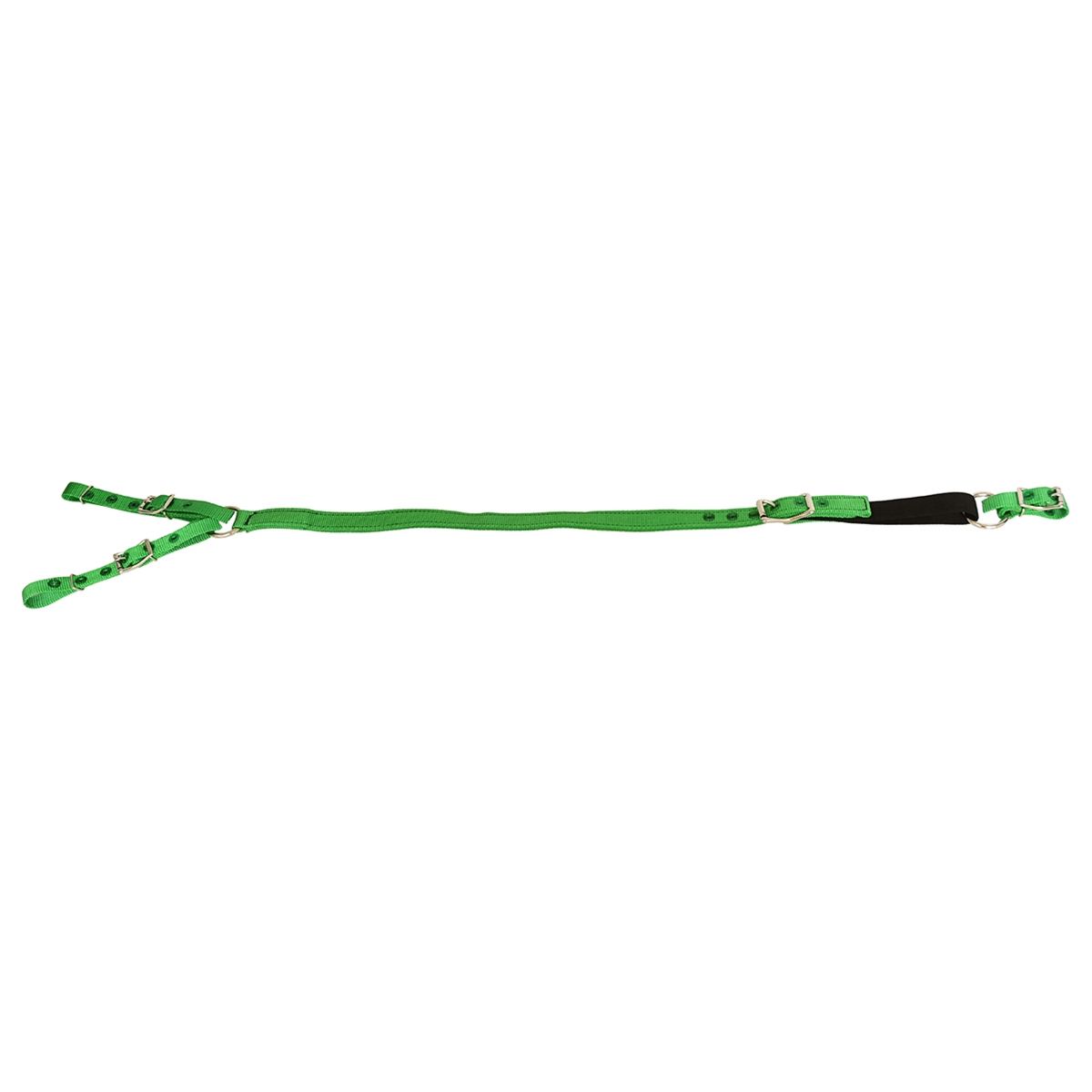 Daisy reins or anti-grazing reins are a great option for young riders or beginners aboard horses or ponies who like to stop for a snack on the trail. These reins clip to the D rings on an English saddle and run the length of the horse's neck and buckle onto the crownpiece of the bridle. This gives the horse freedom of motion during normal movement, but prevents them from being to get their head all the way down to the ground for an unscheduled snack. Some riders also find these reins helpful in preventing a horse putting their head down to buck.