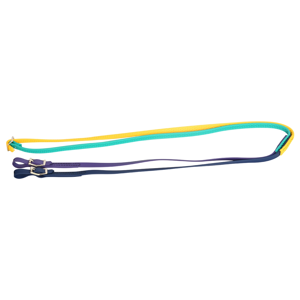 Any Color/Any Width Beta Biothane Base available in 5/8" (recommended), 3/4" or 1" inch widths. Strong, supple reins have a leather-like feel and matte finish. English Style reins - One Piece Reins with Buckle in middle.