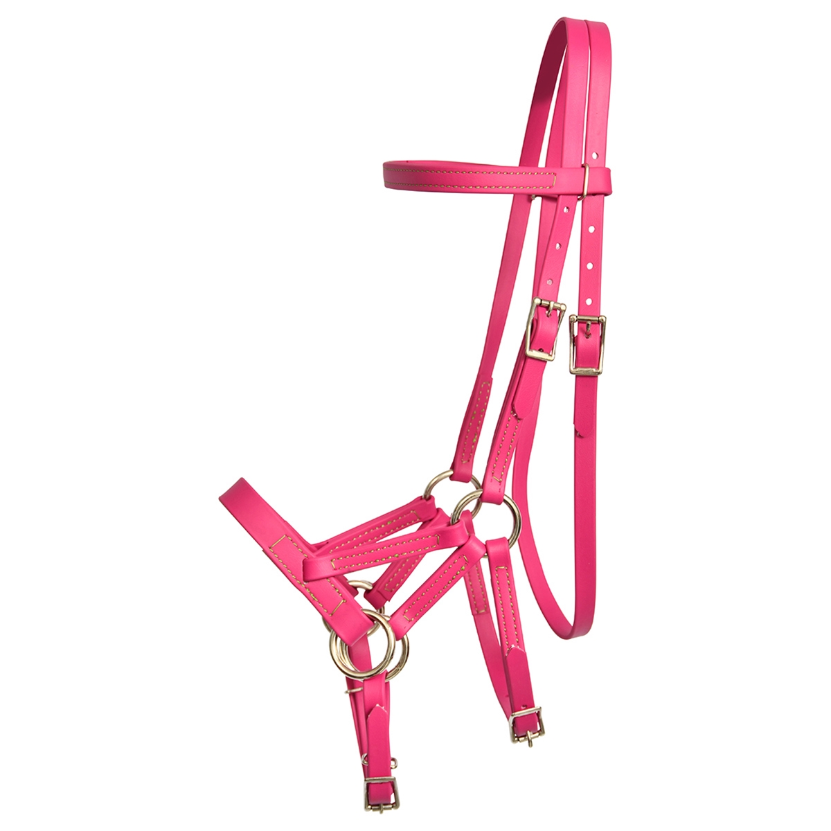 ****PHOTO SAMPLE*** $30 Raspberry/Magenta Pink Beta Biothane with Lime Green Thread Sidepull Bitless Headstall - Horse Size
