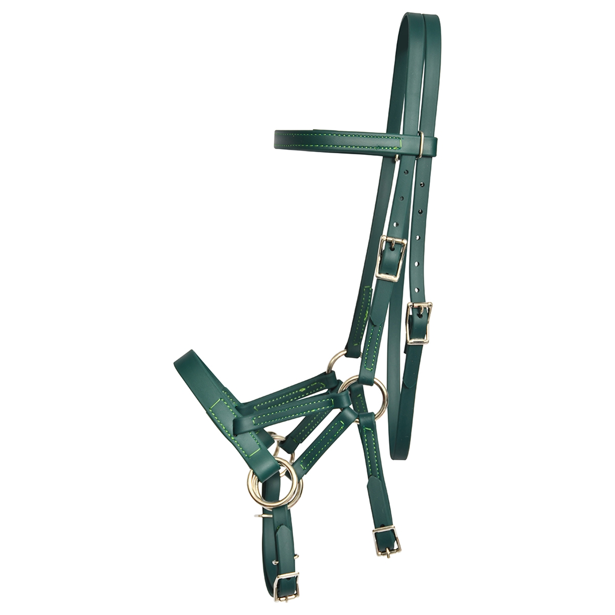 ****PHOTO SAMPLE*** $30 Hunter Green Beta Biothane with Lime Green Thread Sidepull Bitless Headstall - Horse Size