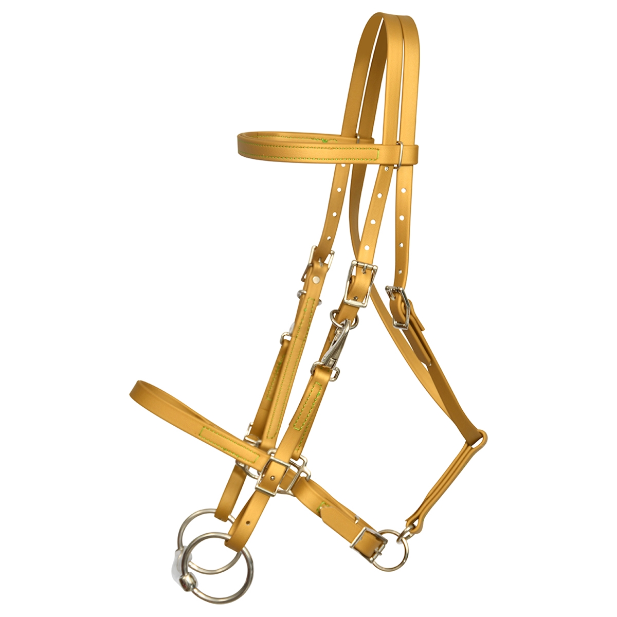 ****PHOTO SAMPLE*** $30 Gold Beta Biothane with LIME GREEN THREAD Halter Bridle with Bit Hangers Headstall - Horse Size
