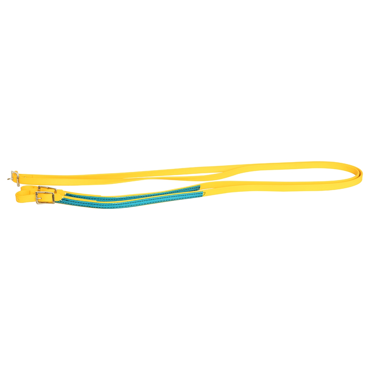 ****PHOTO SAMPLE*** $10 Sunflower Yellow Beta Biothane English Reins with Light Blue Overlay and Roller Buckles on Bit Ends