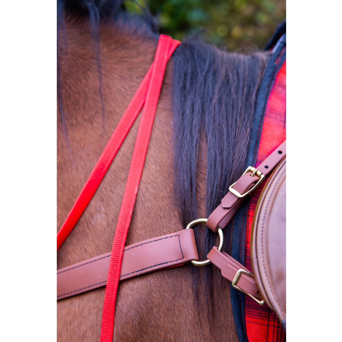 Simple, adjustable, one piece breast strap that is highly effective keeping saddle from slipping.