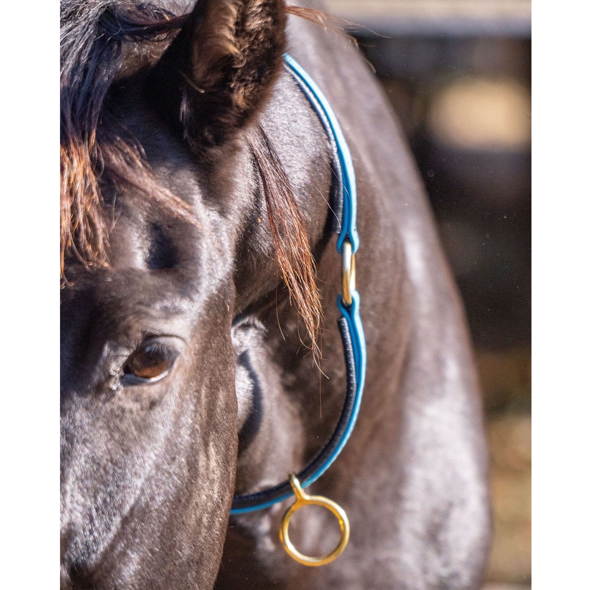 This neck collar features a buckle closure and is fully adjustable. This design includes a metal loop threaded through the collar for attachment to a picket line. The loop can move across the collar to allow the horse some degree of comfortable movement.