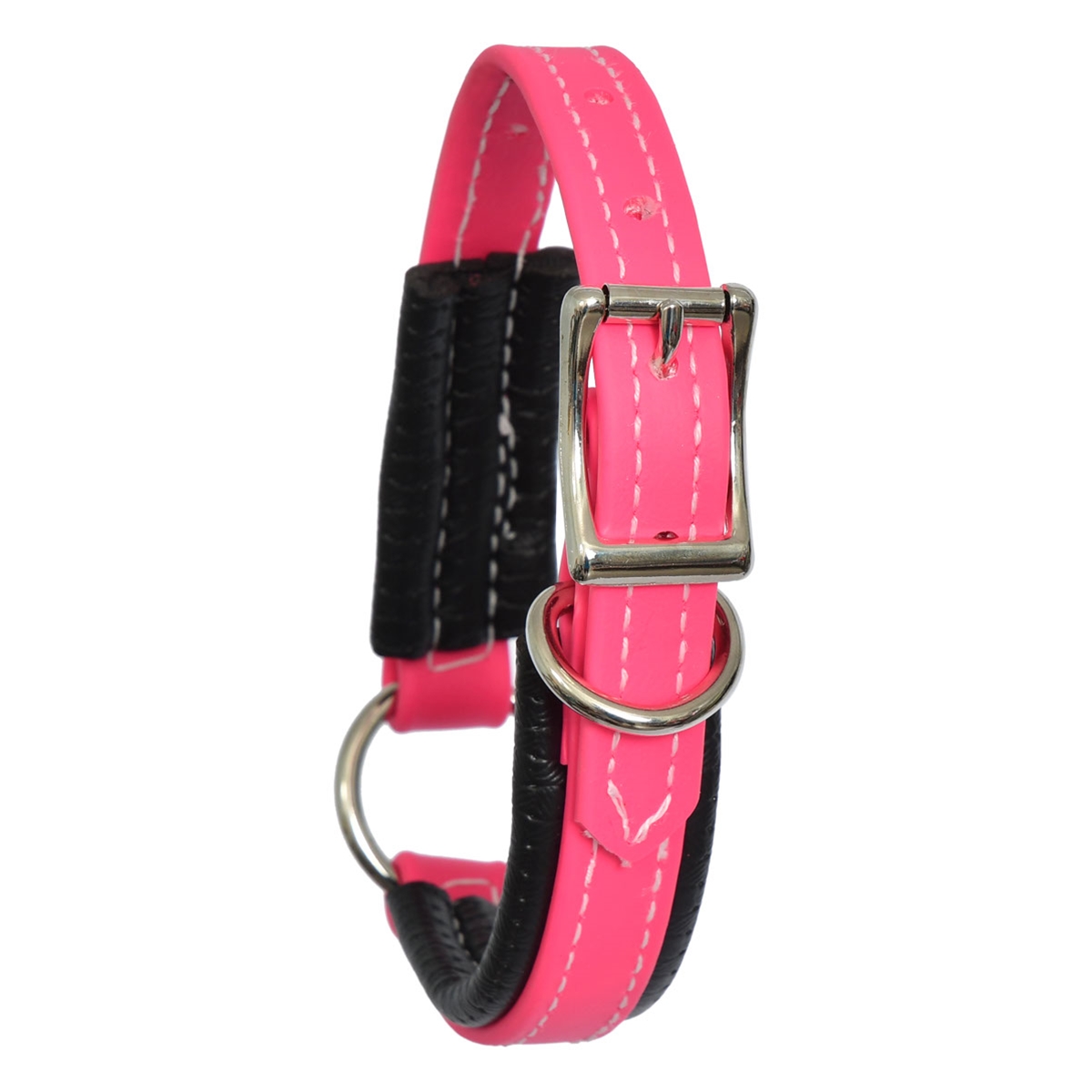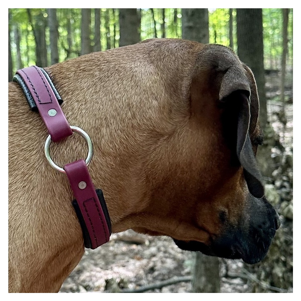 Custom made dog collar with center ring to improve safety, keeping the leash away from the buckle. Made from beta biothane with light weight neoprene padding.