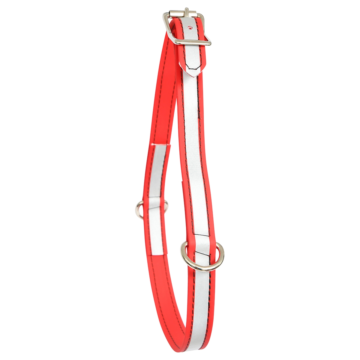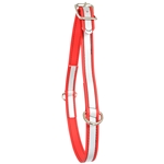 This neck collar features a buckle closure and is fully adjustable. This design features metal rings on either side so a horse can be placed in crossties for a good grooming session.